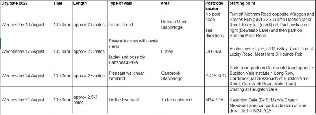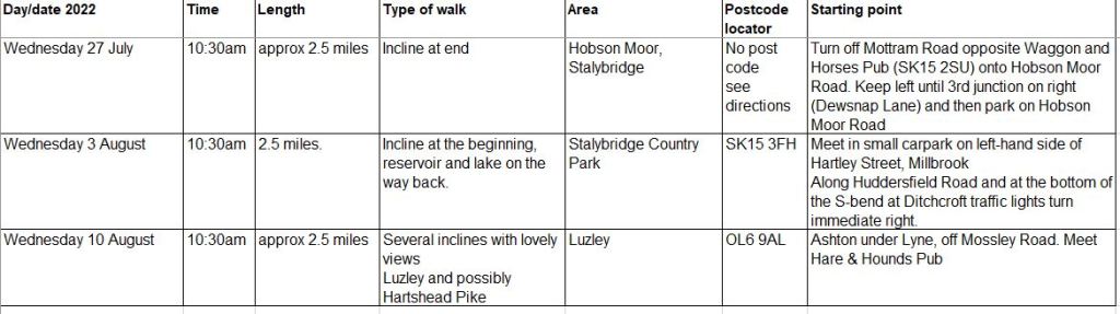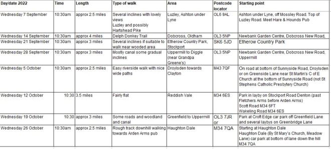 | Wednesday 25 May | 10:30am | Leesbrook Trail, Oldham | Couple of inclines and a set of shallow steps | approx 3.25 miles |