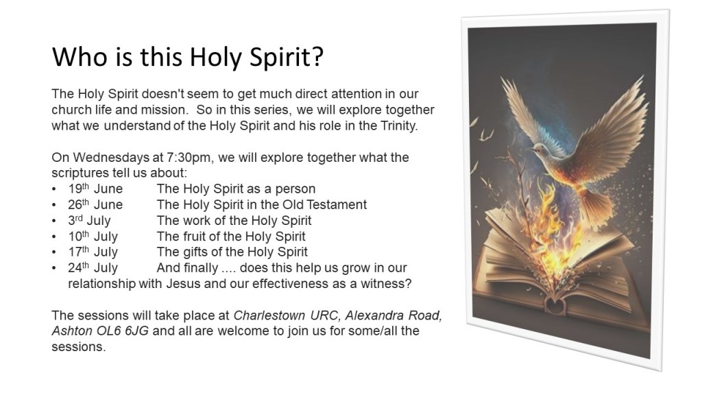 During the Pentecost festival, the Holy Spirit was poured out on the first disciples. As we remember this as the birth of the Christian Church, perhaps we are left wondering whether this is relevant for us today and who, on earth, is this Holy Spirit? Come and join us as we explore what the Bible has to say and what it might mean for us: